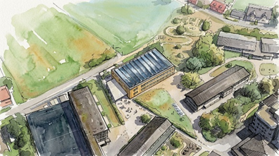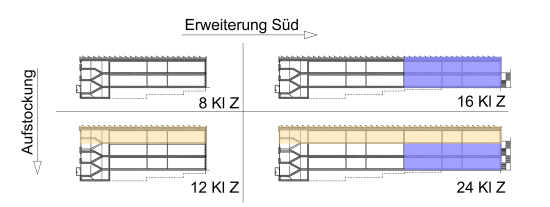 Der optimierte Bau fügt sich elegant in das bestehende Ensemble ein, legt Wert auf eine hochwertige Fassaden- und Landschaftsgestaltung und lässt Raum für die zukünftige Entwicklung der Schule. Wenn der Bedarf besteht, könnte das Projekt RATIO durch einen Anbau im Süden oder durch eine Aufstockung flexibel erweitert werden.